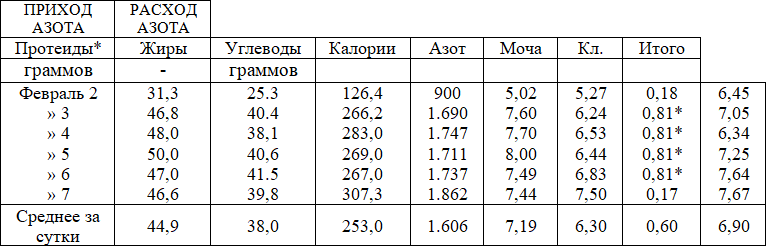 Таблица, помещенная ниже, дает суточное, в течение шести дней, потребление протеидов, жиров и углеводов и вычисленную теплопроизводительную способность, затем потребление азота и его выделение в твердых и жидких отбросах. Было получено много других данных, показывающих уменьшение выделения мочевой кислоты, ароматических сульфатов, фосфорной кислоты и т. д., но об этом мы не будем говорить теперь.