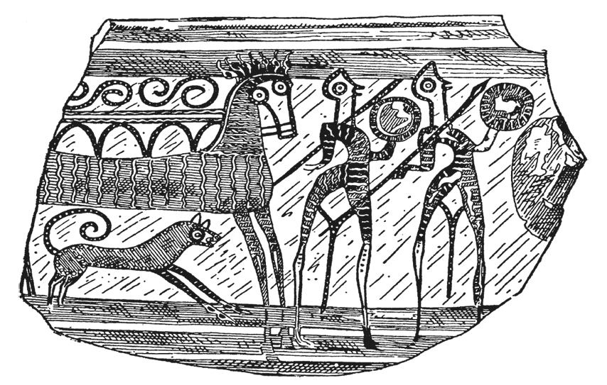 Учитывая все это, некоторые авторитетные ученые, такие как сэр Уильям Риджвей, доктор Маккензи и профессор Чадвик, предлагают следующее решение проблемы. Микенский период XVI–XV столетий до н. э. был переходным этапом, сохранявшим наиболее характерные черты микенской цивилизации, но в течение которого уже стали проявляться новшества, присущие ахейской цивилизации. И на самом деле, мы находим среди очень поздних произведений изобразительного искусства микенского периода изображения доспехов и круглых щитов (рис. 5 и фото 3, А), рубящих мечей (рис. 25, 3-4), иногда встречается обряд кремации. С погребениями последнего типа часто связаны предметы импорта, такие как броши или фибулы очень простого типа (рис. 8, 1-4). В это же самое время становятся заметными и изменения в манере росписи керамики. Если в микенский период преобладал свободный стиль с присущими ему морскими или растительными мотивами, то теперь намечается переход к строгому стилю, с присущим ему стремлением к симметрии и правильным пропорциям, в котором уже заметны отличительные особенности вазовой живописи античного периода и для которого характерен интерес к изображению человеческого тела. Кроме того, некоторые более поздние мотивы вазовой живописи иногда странным образом проявляются в некоторых произведениях типично микенского репертуара. В состав недавно найденного «клада» этой эпохи входил хеттский головной убор, который доказывает реальность набегов, упоминающихся в хеттских надписях.