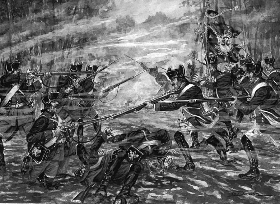 Расточительностью нашего барина и происками интендантов проблемы русской армии не исчерпывались. Одно из распространённых определений тех кампаний – «война в кружевах». Армия шагала по Курляндии как на параде – а у некоторых генералов не было не только боевого опыта, они и серьёзными учениями никогда не командовали. «Весёлая царица была Елисавет» – вот и не воевала Россия почти полтора десятилетия. Отсюда и неопытные генералы. Молодой Румянцев на этом фоне выглядел бывалым воякой – всё-таки участвовал в нескольких походах, дрался со шведами, осаждал Гельсингфорс. Скоро он и пудре объявит войну – но до поры терпел всю эту противоестественную солдатскую парфюмерию. К тому времени он уже не давал себе поблажек, полностью посвящал себя армии. Почти все русские офицеры уважали Фридриха – и Румянцев не был исключением. Но многие Фридриха попросту боялись – только не Румянцев! Он вступил в войну с твёрдым намерением бить пруссаков, не вспоминая про их непобедимость.