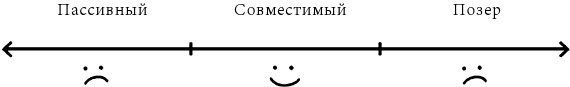 СовместимостьСовместимость означает, что окружающие рядом с вами чувствуют себя комфортно и естественно, наслаждаются вашей компанией. Не стоит недооценивать себя (так вы будете выглядеть пассивным), но не надо и прыгать выше головы (так вы будете выглядеть позером).