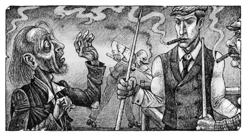 В бильярдной воцарился поистине адский переполох. Пьянчужки скулили в ужасе пред гневным демоном, коего ненароком пробудили. Юный Тревер был ошеломлен и смятен без меры случившимся. Он медленно отползал к стене по мере того, как усиливалась заварушка.