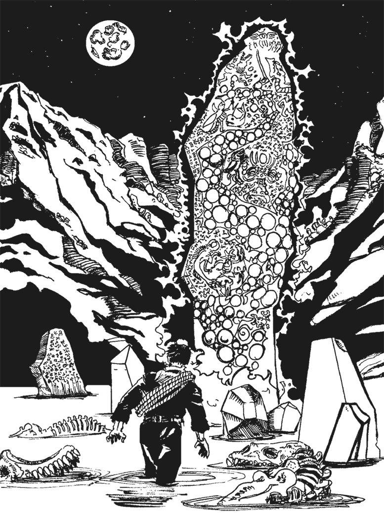 Мое внимание вдруг привлек огромный необычайный предмет на противоположном склоне, круто вздымавшемся на сотню ярдов передо мной; предмет этот белесо сиял в едва пролившихся лучах восходящей луны. Как я вскоре убедился, это был попросту гигантский кусок камня, однако у меня сложилось явственное впечатление, что его положение и очертания не были творением одной лишь Природы. При более внимательном изучении я преисполнился чувств, которые не могу выразить, ибо, несмотря на его огромную величину и на его положение в бездне, что зияла на морском дне со времен, когда мир был еще молод, я без сомнения распознал, что этот странный предмет был умело отделанным монолитом, чья великая громада знавала искусственную обработку и, возможно, поклонение живых и мыслящих созданий.