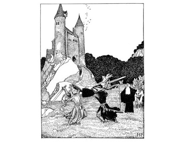 И вот, в третий раз, подготовившись таким образом к нападению, эти два великих рыцаря бросились друг на друга в яростной атаке. И теперь, как и дважды до этого, король Артур так метко ударил Черного Рыцаря в центр его защиты, что копье, которое он держал, разлетелось в щепки. Но на этот раз копье его противника не сломалось, а выдержало. И таким сильным был удар, который он нанес по щиту короля Артура, что он пронзил его насквозь. Затем подпруги королевского седла разорвались от этого сильного, мощного удара, и он и его конь были отброшены назад. Так что король Артур, возможно, был бы повержен, если бы он не освободил свое седло с необычайным искусством и рыцарским мастерством, поэтому, хотя его лошадь была опрокинута, он сам все еще держался на ногах и не упал в пыль. Тем не менее, удар, который он получил, был настолько сильным, что на некоторое время он полностью лишился чувств, так что всё закружилось у него перед глазами.