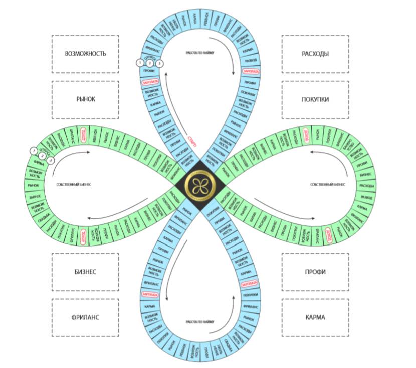 ЦЕНТР. С этого поля начинается игра. Если в процессе Вы попали на центральное поле, то можете уйти с восьмерки «ПО НАЙМУ» на восьмерку «БИЗНЕС», при этом навсегда лишаетесь заработной платы и сможете работать уже по 3 видам фриланса. И наоборот, уйти с восьмерки «БИЗНЕС» на восьмерку «ПО НАЙМУ». Расходы остаются в прежнем размере. Если менять восьмерку Вы не намерены, то продолжайте играть как прежде.