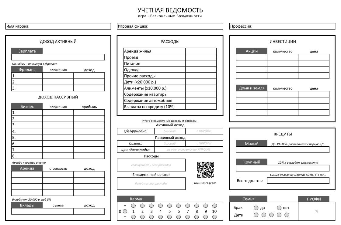 КРЕДИТНАЯ КАРТА (ДО ЗП Х2) – в любой момент Вы можете взять деньги до зарплаты или дохода, воспользовавшись кредитной картой. Если Вы возвращаете сумму займа до того, как пройдет клетку зарплата/доход, то процент с него не взымается. Если же вернуть долг до зарплаты/дохода не удается, то необходимо вернуть долг в двойном размере. Если такой возможности нет, то впишите сумму займа по кредитной карте в двойном размере в ведомость по строке ДОЛГИ.