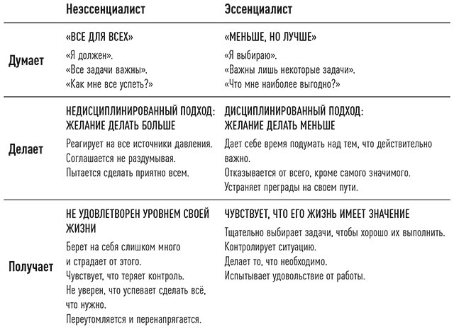 Разница между эссенциалистом и неэссенциалистом показана в таблице на следующей странице. Оба человека прикладывают одинаковые усилия. Вот только в левой части таблицы эти усилия распределяются между десятками различных заданий. Этот человек, скорее всего, продвигается в каждом из своих дел очень медленно и не чувствует никакого удовлетворения от успехов. Человек из правой части таблицы тратит силы всего на несколько задач. В результате он видит свой прогресс в важных для него областях, и это приносит ему радость. Путь эссенциалиста означает отказ от убеждения, что мы можем успеть всё. Вместо этого он требует, чтобы мы реально смотрели на вещи и принимали тяжелые решения. Зато во многих случаях одно такое решение избавит вас от тысячи необходимостей делать выбор в будущем, а значит, вам не придется снова и снова задавать себе один и тот же вопрос.