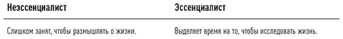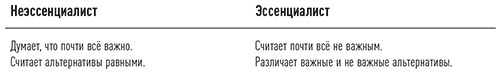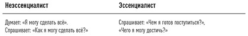 Парадокс эссенциализма состоит в том, что его приверженцы рассматривают больше опций и вариантов, чем обычные люди, которые с восторгом реагируют на любую возможность, встречающуюся им на пути. Неэссенциалист готов гнаться за первым попавшимся шансом, а значит, у него нет времени вдуматься, что он делает. Путь эссенциалиста – в исследовании и оценке большого количества альтернатив, а уже только потом в выборе единственной. А раз эссенциалист планирует использовать по максимуму только один шанс, ему необходимо исследовать все варианты, чтобы не ошибиться.