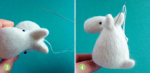 4 Tie the two loose threads together, tugging gently to ensure that the eyes are tight within the felt, and finish off the knot.