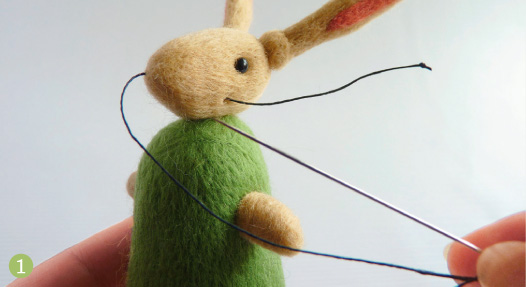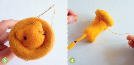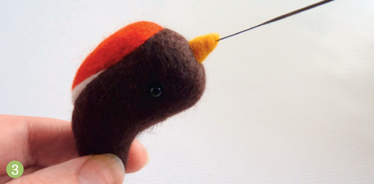 1 Position a guide needle in the spot where the beak is to go. Take a very small amount of wool and, using another needle, anchor one end of the wool into the body.