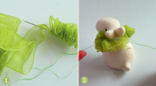 Ruffs add extra cuteness. You can make a ruff from ribbons, lace or textiles, but bear in mind that you will need at least four times as much material as the circumference of the neck. Here I have used wire-edged ribbon, which holds the creases nicely.