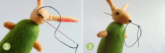 1 To stitch a nose, preferably use thick cotton or a waxed thread. Thread a long needle and knot one end of the thread. Take the thread in at the side of the face, a little distance from where the nose is to be.