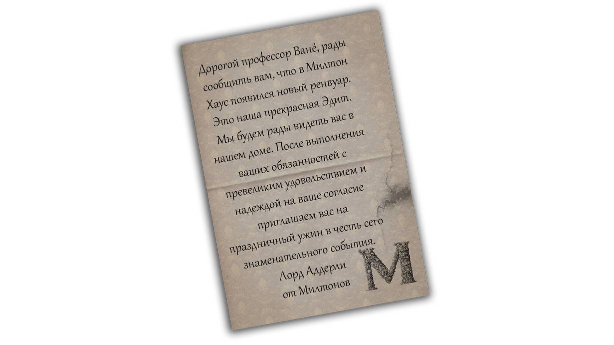 “Дорогой профессор Ванé, рады сообщить вам, что в Милтон Хаус появился новый ренвуар. Это наша прекрасная Эдит. Мы будем рады видеть вас в нашем доме. После выполнения ваших обязанностей с превеликим удовольствием и надеждой на ваше согласие приглашаем вас на праздничный ужин в честь сего знаменательного события.