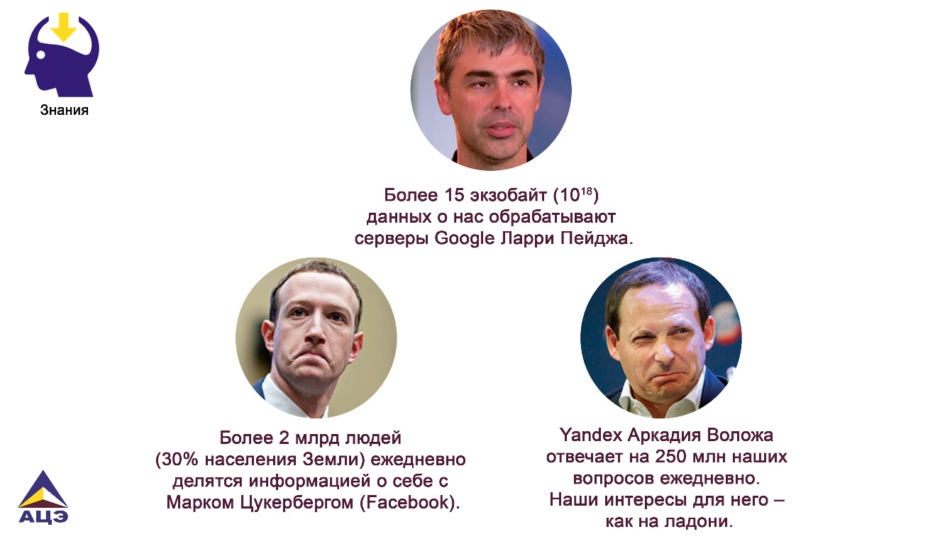 В эпоху информации парадигма посредничества могла быть сформулирована так: «Вы (покупатель) знаете, что вам нужно в данный момент, я (продавец) тоже знаю». В эпоху знаний парадигма меняется: «Я (продавец) знаю, что вам (покупателю) нужно, даже если вы сами этого еще не знаете». Полный цифровой профиль можно сравнить с ключом, открывающим дверь к управлению потребительским поведением человека. Получить такой ключ законным образом практически невозможно, но подобрать – вполне. Именно подбором ключей к человеческим потребностям занимаются сегодня глобальные интернет-компании, именно на этой деятельности зиждутся крупнейший в мире личные состояния, именно здесь начинает формироваться сущность, которую мы называем «цифровой экономикой».