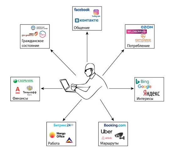 Помимо того, что любые сети в той или иной степени являются ловушками для индивидуума, они выполняют еще одну сомнительную с точки зрения этики функцию, а именно, осуществляют цифровое социальное профилирование (рис. 7). Каждая из сетей, членом которой является конкретный человек, собирает о нем всю доступную информацию, при этом члены сети не знают, как и для каких целей эта информация будет использоваться в дельнейшем. Очевидно, что в условиях бесконтрольного оборота больших пользовательских данных (БПД) такое положение дел представляет прямую угрозу для каждого члена общества.