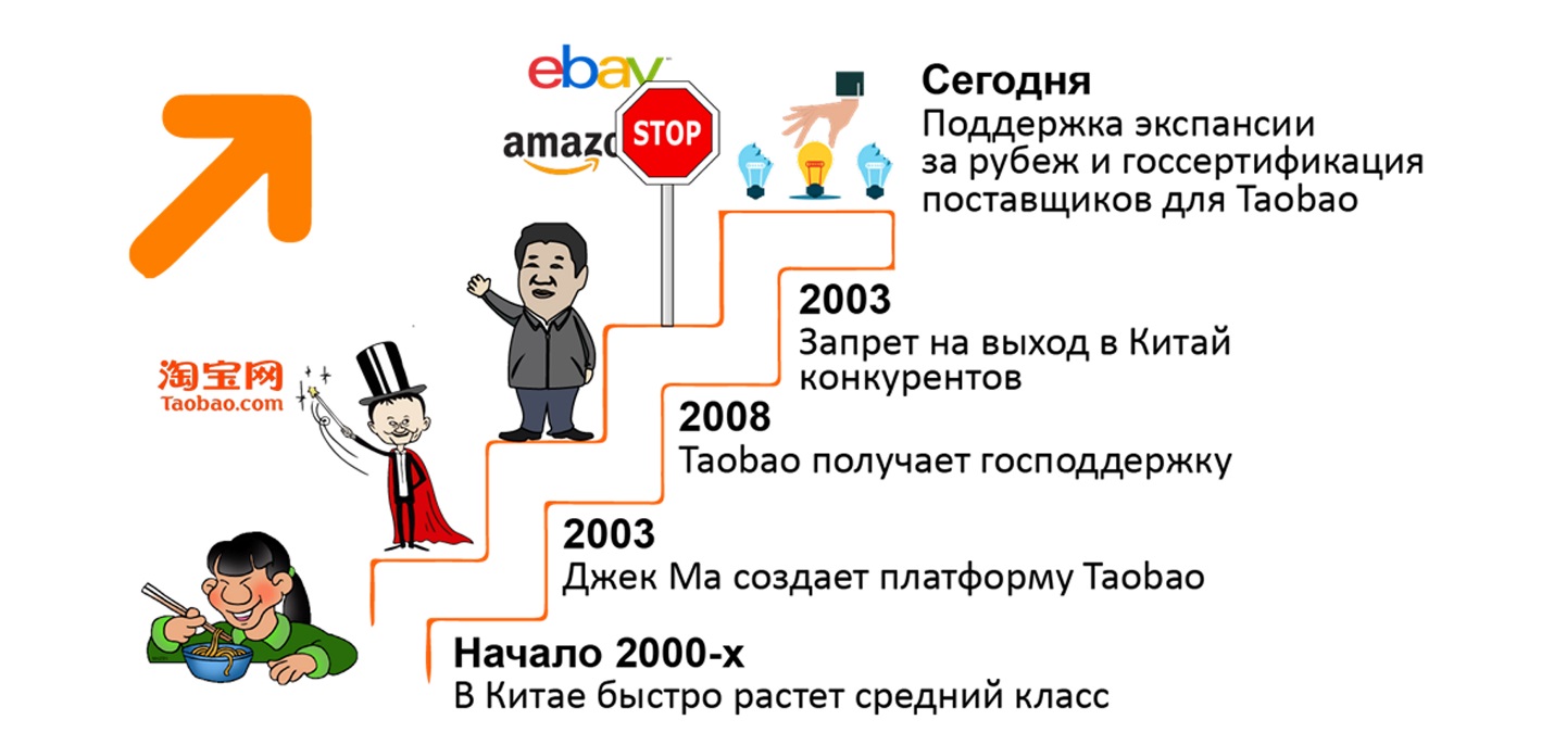 Alibaba Group. Alibaba Group – очень показательный пример. Ее многофункциональная цифровая платформа – Taobao – в 2003 г. изначально создавалась для внутреннего китайского рынка. Стимулом к ее созданию стал бурный рост численности среднего класса в Китае в начале 2000-х годов. Реформы Дэн Сяопина, начатые еще в конце 1970-х гг., и переход к рынку в 1990-х дали свои плоды: общество, состоявшее преимущественно из производителей постепенное трансформировалось в общество потребления. Прекрасно зная особенности китайской культуры и бизнеса, Taobao с самого начала с успехом конкурировала с такими гигантами, как eBay и Amazon.com, мгновенно копируя их бизнес-модели и адаптируя их под потребности китайских пользователей. Став к 2008 г. фактически монополистом на рынке электронной коммерции Китая, Alibaba Group получает с тех пор активную поддержку в форме своеобразного «частно-государственного» партнерства. Под самыми разными предлогами через «великий китайский файрвол» правительство ограничивает доступ многих американских компаний – от Google и Facebook до голливудских киностудий – на рынок Китая (рис. 10).