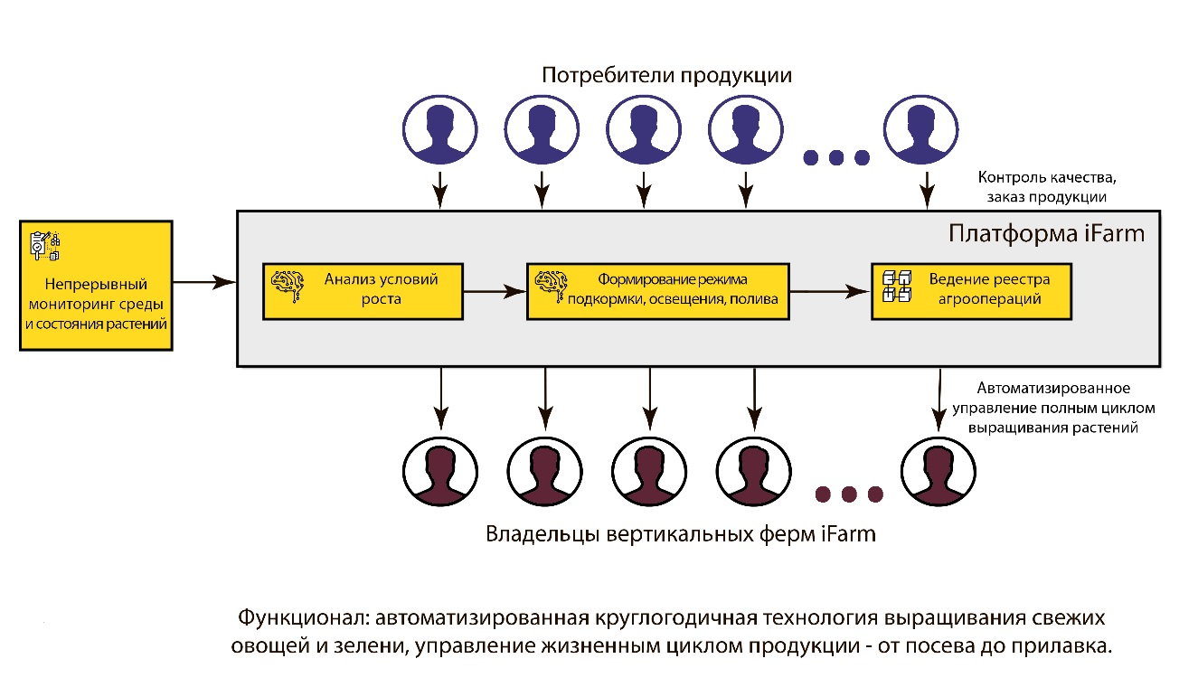 iFarm – «умное» сельское хозяйство (рис. 12). Проект iFarm – пример организации малого овощеводства в условиях цифровой экономики, созданный группой энтузиастов – технологов, агроинженеров, программистов (один из немногих живых стартапов Сколкова). Клиенты iFarm имеют возможность круглогодично и на минимальных площадях выращивать свежие овощи, зелень и ягоды. В основе технологии лежат так называемые вертикальные фермы, которые могут сооружаться в самых разных местах – от отдельных зданий до крыш жилых домов или коттеджей. Цифровая платформа iFarm полностью контролирует процесс выращивания – от приобретения семян до сбора урожая. Под контролем iFarm находятся такие показатели, как всхожесть семян, температура, влажность, освещенность, химический состав готовой продукции (содержание питательных веществ, сахаров, витаминов и т. д.).