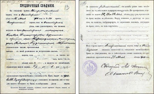 Предбрачные сведения[122], направленные причтом Воскресенской церкви по запросу в Петропавловскую церковь г. Симбирска, удостоверяющие, что симбирская мещанка К. Д. Ефимова действительно является прихожанкой, по исповедным ведомостям числится девицей, «находится в здравом уме и твердой памяти; вступает в брак с избранным ею лицом с дозволения родителей своих, равно как изъявляет на то собственное непринуждённое согласие. По троекратном оглашении в церкви 20, 21 и 22 мая месяца 1906 года, препятствий к браку никем не объявлено и со стороны причта Воскресенской церкви г. Симбирска никаких препятствий в совершению вышесказанного брака не усматривается…». 23 мая 1906 г.[123]