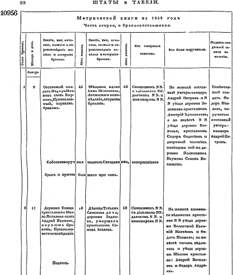 Форма метрической книги, утверждённая Сенатским указом «О ведении метрических книг по новым формам» от 7 февраля 1838 г. Часть вторая «О бракосочетавшихся»
