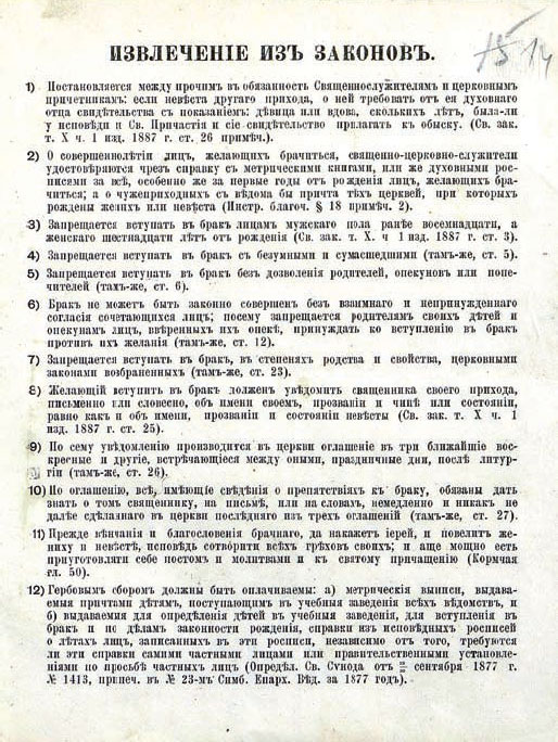 Извлечение из Свода законов Российской Империи, Определений Святейшего Синода, Инструкций благочинным, Кормчей книги, касающееся заключения брака. до 1917 г.[129]