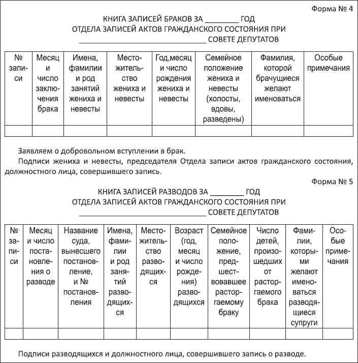 Браки регистрировались по месту пребывания жениха и невесты в отделах записей браков. Помимо заявления о вступлении в брак, которое могло быть как устным, так и письменным, брачующиеся своими подписями должны были подтвердить, что не имеется препятствий к заключению брака между ними, а также, что они вступают в брак добровольно. Только после этого событие брака заносилось в книгу записей, и брак объявлялся вступившим в законную силу. Брачующимся незамедлительно выдавалась копия свидетельства об их браке (ст. 4). Этим же декретом утверждалась форма книги записей браков. В книгу записей браков вносились следующие сведения: год, данные об органах, регистрирующих брак (отдел управы, отдел записей браков), номер регистрируемого брака, день и месяц заключения брака, имя, отчество, фамилия жениха и невесты, возраст жениха и невесты, фамилия, которой будут впредь именоваться вступающие в брак, постоянное место жительство и адрес, особые примечания; подписи жениха и невесты, подтверждающие добровольность вступления в брак и отсутствие препятствий для брака, подписи должностных лиц, зарегистрировавших брак, и печати соответствующих органов.