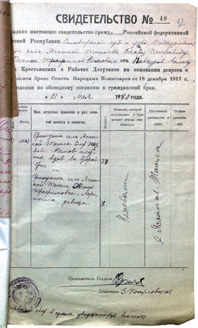 Свидетельство[132] за № 49 о заключении брака между вдовцом Немовым Е. П. и девицей Харитоновой К. Т., гражданами с. Ясашная Ташла Симбирского уезда Симбирской губернии, выданное отделом ЗАГС исполнительного комитета Подкуровской волости. 21 мая 1920 г.[133]