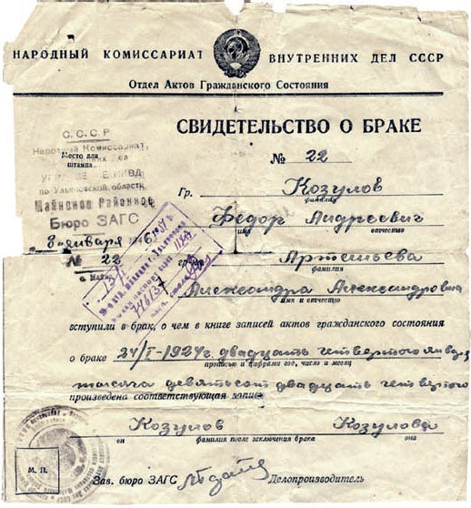 Свидетельство[134] о браке за № 22 Козулова Ф. А. и Артемьевой А. А., заключенном 24 января 1924 г., выданное Майнским районным бюро ЗАГС Ульяновской области. 8 января 1946 г.[135]