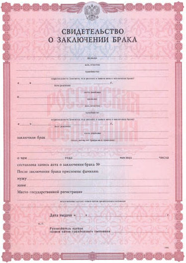 Свидетельство о регистрации брака граждан Российской Федерации. Бланк 1998 г.