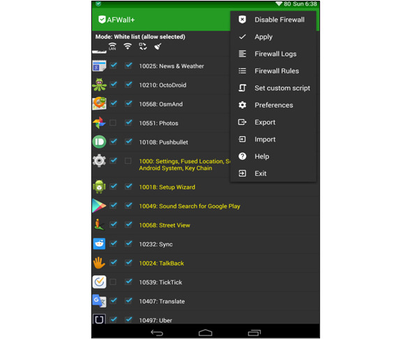 Для мобильных устройств тоже есть своеобразный прикладной межсетевой экран, например, «AFWall». «Android Firewall+» – это продвинутый редактор «iptables» (с графическим интерфейсом) для «Android». Он обеспечивает детальный контроль над тем, каким приложениям устройства разрешен доступ к сети [6] (рис. 14). Скачать его можно с «Google Play»: https://play.google.com/store/apps/details?id=dev.ukanth.ufirewall и с «GitHub» https://github.com/ukanth/afwall/releases/.