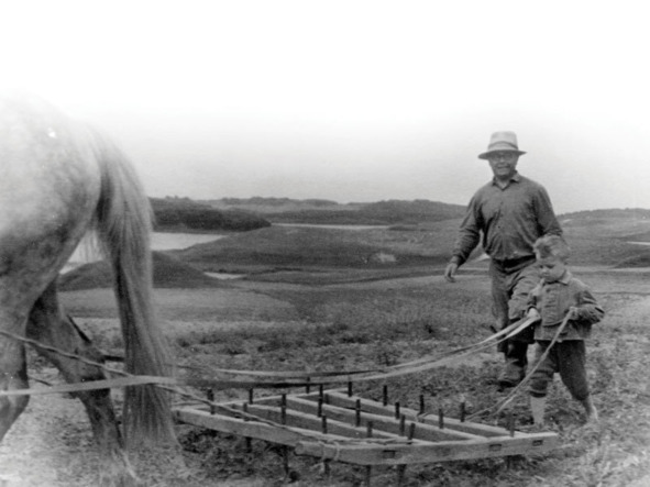На горе у Первого (Лугового) озера в конце Зелёной улицы у деда было поле. Там мы сажали картошку. Конечно, плуг в то время мне было не удержать, но за бороной я ходил вполне исправно. Наш школьный коняга90 Орлик был доброго нрава, поэтому дед отдавал мне вожжи91, а сам шёл сзади. Я же, словно аист, вышагивал по пашне, крепко сжимая в руках длинные вожжи. Моя макушка едва доходила до середины густого хвоста ме́рина92. И от того, что дед доверил мне управлять этой живой горой, я, переполненный чувствами, готов был обнять всю землю…