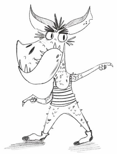Поднялся очень страшный монстр с ярко оранжевыми глазами и вертикальными зрачками, как у кошек, они могут светиться в темноте. Кожа лимонного цвета грубая и толстая, как у носорога. Уши острые как у гоблина, кривые страшные зубы и когтистые лапы. Вместо носа две большие вертикальные ноздри. Он носил полосатую майку безрукавку и на нижних лапах носки без обуви.