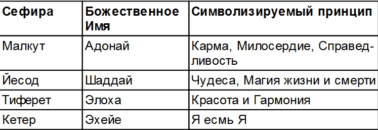 Чтобы пройти путь к Единству, ученик должен отразить в себе четыре Божественных Аспекта, называемых также «Божественными Именами», которые соответствуют четырем Сефирам центральной оси. Рассмотрим эти соответствия в порядке восхождения.
