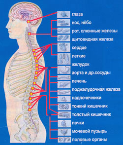 Нервные стволы, выходящие из спинного мозга, корни которых расположены между позвонками, регулируют жизнедеятельность всех внутренних органов человеческого организма. Поэтому повреждение одного из корешков этих нервов может привести к различным симптомам и заболеваниям внутренних органов, иннервируемыми этими нервами. Например, некоторые болезни сердца, лёгких, печени, поджелудочной железы, кишечника, мочевого пузыря, половых и других органов. В последнее время установлена связь у пациентов с жалобами в поясничном и грудном отделах позвоночника и обострением язвенной болезни двенадцатиперстной кишки (сайт: ПартнерыМедНовостиПубликации).
