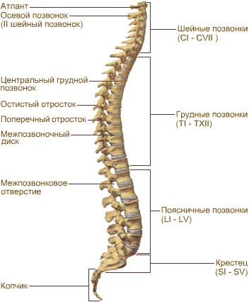 Позвоночник является наиболее ранимым и в то же время прекрасно защищающим важнейший орган человека – спинной мозг. Спинной мозг является продолжением головного мозга до поясничных позвонков включительно. Он имеет цилиндрическую форму и повторяет форму канала, который образуют соединённые между собой шейные, грудные и поясничные позвонки. Здесь же находятся главные центры центральной нервной системы по управлению организмом в целом и отдельными его системами и органами в частности. Позвоночный столб состоит из 32 позвонков и большого количества суставов, способных смещаться относительно друг друга. Это даёт нам возможность осуществлять различные движения в разные стороны. Тем самым мы имеем возможность наклоняться вперед, в стороны и прогибаться назад. Между позвонками находятся естественные амортизаторы – межпозвоночные диски. Эти диски упругие и эластичные в течение дня могут менять свою эластичность и форму. В результате этого рост человека может меняться в течение дня. После ночного отдыха межпозвоночные диски снова расправляются, но днём опять сжимаются. В результате рост человека в течение дня может варьировать. Поэтому человек утром обычно на 2–6 сантиметров выше, чем к концу дня. Как видно из рисунка позвоночный столб делится на 7 шейных (C I–C VII), 12 грудных (T I – T XII), 5 поясничных (L I–L V) 5 крестцовых позвонков (S I – S V), оставшиеся 3–4 позвонка приходятся на копчик. Крестцовые и копчиковые представляют собой сросшиеся позвонки, которые несут на себе также огромную нагрузку. Там где имеются сочленения костей – это суставы, и связки. Роль последних удерживать эти суставы в определённом положении и не покидать своих сочленяющихся поверхностей. Но природа обделила связками многочисленные суставы позвоночного столба и плечевые суставы. Поэтому в этих местах часто бывают вывихи. Позвоночный столб по всей своей длине имеет всего лишь две связки, спереди и сзади, так называемые – длиннющие связки. Понятно, эти связки не способны удерживать все 32 позвонка, хотя бы 24 самых подвижных, при больших нагрузках в правильном физиологическом состоянии.