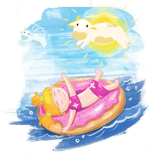 В полдень солнце влило в мореКовш парного молока.Браво солнечной корове,Что пасётся в облаках!Я, от счастья замирая,Среди тёплых волн плыву!Пена волн теперь парная:Это − чудо наяву!И, пока плыву я в далиНа спине и на боку,Я мечтаю, чтоб упалиС неба плюшки к молоку!