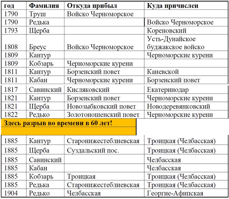 По этой таблице видно, что заселение родственниками – Кантур, Редько, Савинские и др. станицы Каневской началось – 1811 гг., а Челбасской в 1885 году.