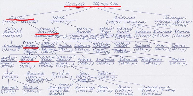 Щербы на КубаниИсследования Щикальцовой Ольги Ивановны показывают, что кубанских корней Кантуров по женской линии начинаются с рода Щербы. В «казацких сказках» за 1760-е годы упоминаются первые из рода Щерба – Сергей Щерба (около 1744 г. р.) и его сын Павел Сергеевич Щерба (1764 г. р.) На схеме прародители рода на подчеркнуты красной линией.