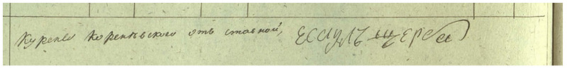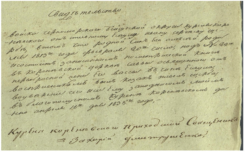 войска Черноморского Бейсугской округи Куреня Кореневского отставному Есаулу Ивану Сергеевичу Щербе в том, что родной сын его Алексей родился 1813 года февраля 20-го числа, под № 22 и состоит записанным по Метрической книге в Кореневской церкви Саввы, освященного от первобрачной жены его Вассы, в чине Есаула, восприемником (крёстным) был козак Павел Щерба, во уверении чего и сие ему за подписом моим в благополучном курене Кореневском дано апреля 16-го дня 1835-го года.