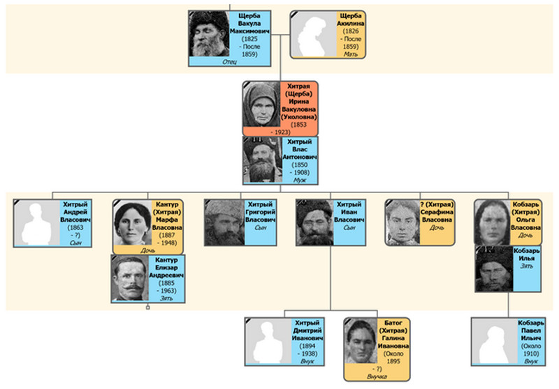 Через три поколения от первого известного нам Щерба появилась Ирина Вакуловна Щерба (1849 г. р.), которая вышла замуж за урядника Хитрого Власа Антоновича (1851 г. р.).