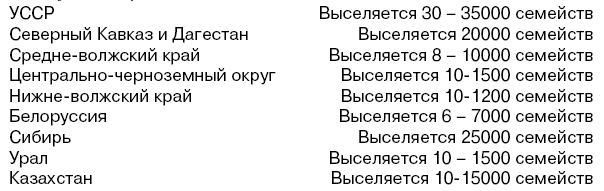 Имущество таких семей конфискуется в том же порядке, как и у выселяемых семейств кулаков. Кампании по выселению кулаков и их семейств проводятся в первую очередь в следующих районах СССР: