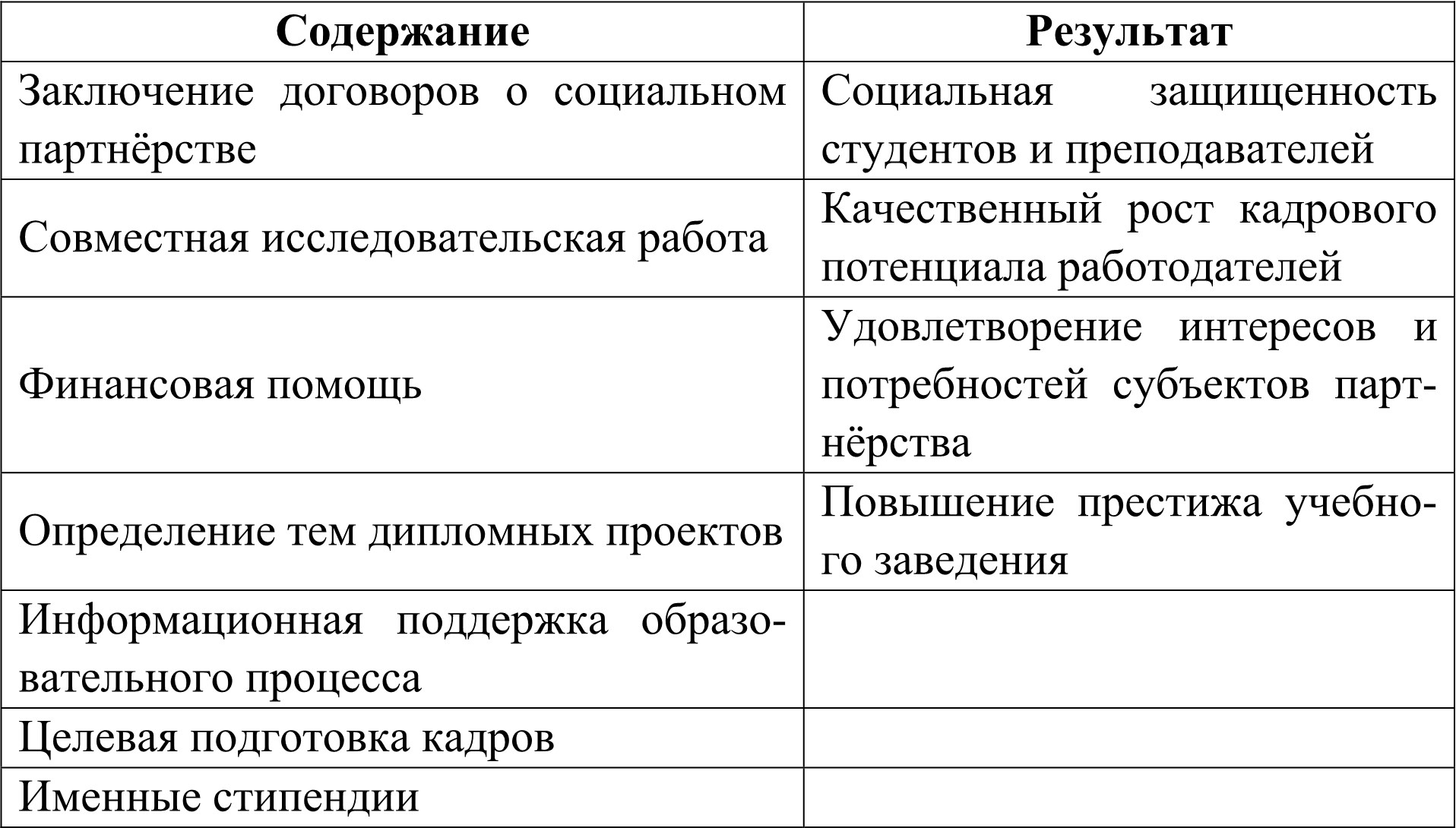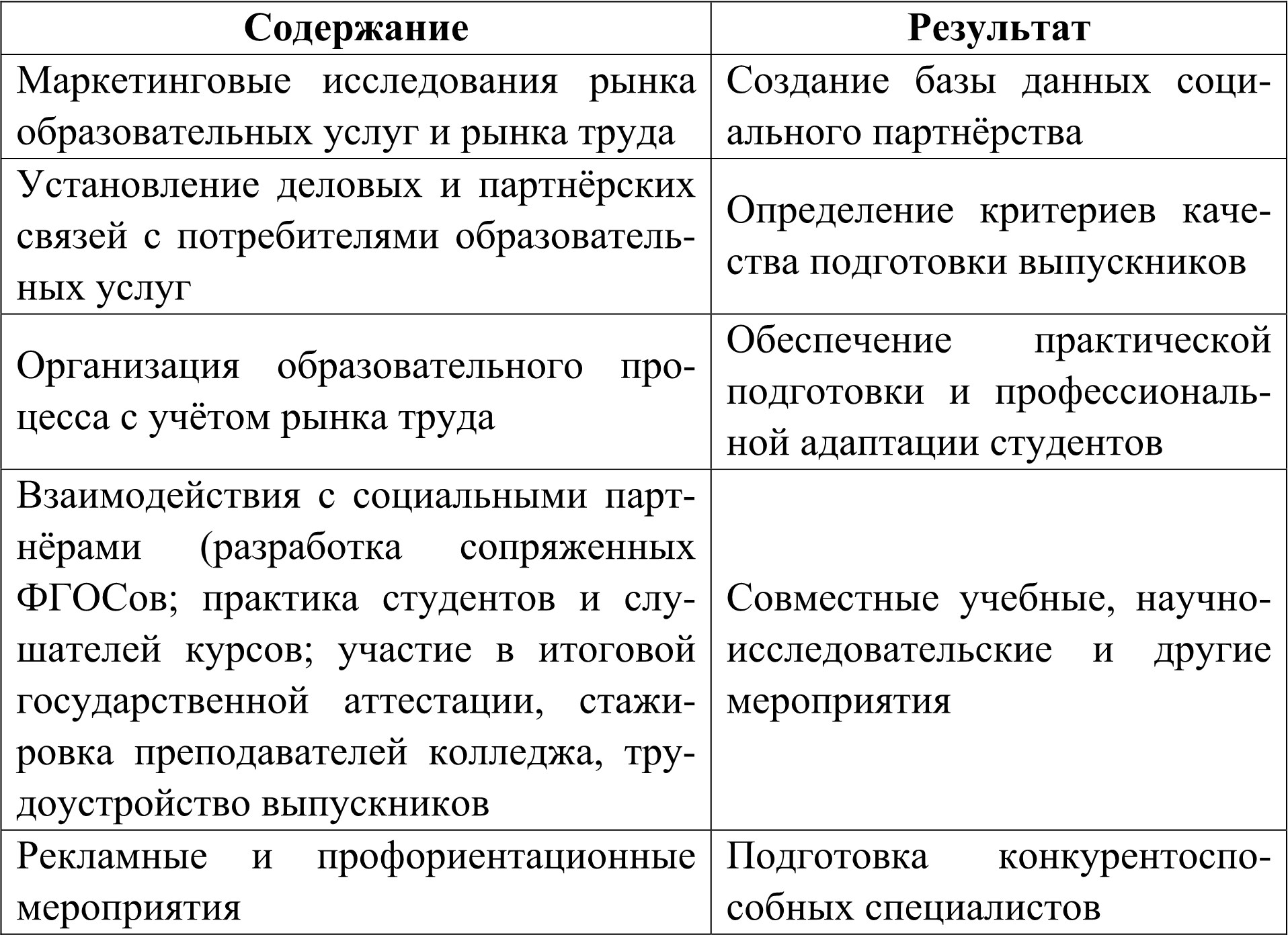 Ю. Ф. Баганников описывает содержание и предполагаемый результат партнёрства, как формы взаимодействия учреждений среднего специального образования с социумом (Таблица 3).