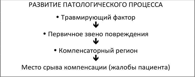Затем возникает каскад компенсаций – формирование вторичного или компенсаторного региона. И в конце каскада компенсаций – там, где не хватило ресурсов, либо там, где сохраняется анатомическое нарушение, – проблема, приводящая к жалобам.