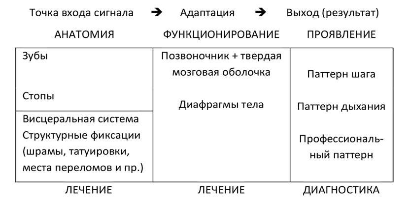 Под анатомическую точку будет перестраиваться всё тело. Если у меня ноги кривые, значит, изначально точки прикрепления мышц расположены неверно, значит, изначально некоторые мышцы будут перерастянуты, а некоторые укорочены. Значит, изначально нагрузка, которая воспринимается моим телом, будет восприниматься искаженно. Значит, и по телу она будет проходить искаженно и, следовательно, потребует больше усилий от адаптационных систем. Мои диафрагмы, мой позвоночник, который проводит нагрузку, моя твердая мозговая оболочка – они вынуждены будут работать с большей нагрузкой.