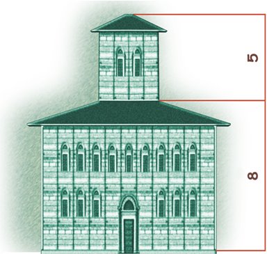 Ты знаешь, что такое золотое сечение? А вот представь себе дом с башней. Их общая высота, скажем, 13 метров. Какова должна быть высота дома и высота башни, чтобы отвечать принципам гармонии? Ответ: высота башни должна быть около 5 м, а высота дома – около 8 м. В такой пропорции наше здание с башней будет красивым, гармоничным, будет отвечать нашим представлениям о прекрасном. А отношение 8:5 и называется отношением золотого сечения, которое требует, чтобы отрезок делился на две части таким об разом, чтобы больший отрезок относился к меньшему (8:5), как весь отрезок – к большему (13:8).