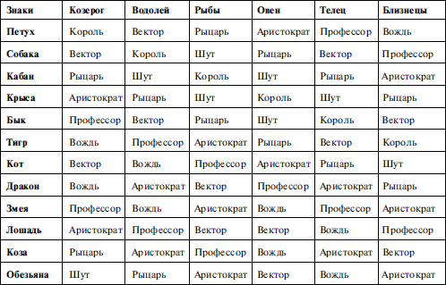 Все остальные персонажи получаются аналогичным путем. Рыцарь – с помощью сдвига на два шага (в обе стороны), Аристократ – сдвигом на три и шесть, Профессор – сдвигом на четыре, Вождь – сдвигом на пять. Все это достаточно сложно, а потому лучше обратиться к таблице, по которой найти свой знак в виртуальном гороскопе очень легко (см. таблицу на стр. 7).