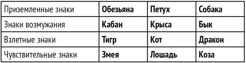 Приземленные знаки(Обезьяна, Петух, Собака)Необходимо обнаружить в себе тягу к действиям и любовь к предметному миру, ибо цель Приземленных знаков – вдохнуть душу в мертвую материю. Как это сделать тем, у кого из рук все валится или к работе никакого расположения? Стоит освоить какое-нибудь ремесло, слава богу, диапазон огромный – от плотницких или малярных работ до ювелирных, часовых дел или делания кино.
