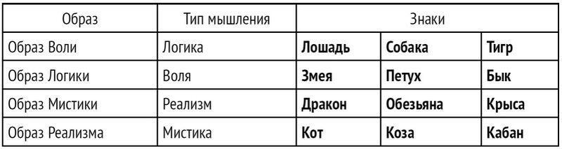 Одна-единственная структура отделяет мужской мир от женского. Эта структура называется Идеологической. Первое и самое главное: женский знак – двойственный. Внешне женский знак копирует мужской, а вот что касается типа мышления, то он от другой тройки знаков. Так у Логических (по образу) знаков Волевой тип мышления. У Волевых (по образу) знаков Логический тип мышления. У Реалистических (по образу) знаков Мистическое мышление. У Мистиков (по образу) Реалистический тип мышления. Итак: четыре группы по три знака.