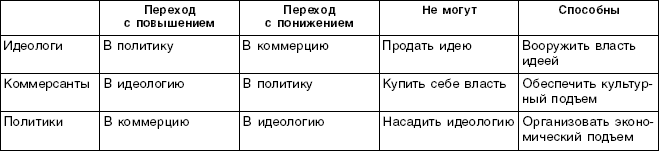 Переходы из политиков в коммерсанты (любой банк примет на лучшее место бывшего министра), из коммерсантов в идеологи (любой институт, музей, театр раскроет объятия спонсору) или из идеологов в политики (партийцы обожают принимать в свои ряды актеров, ученых и спортсменов) проходят легко и с большим подъемом.