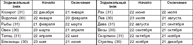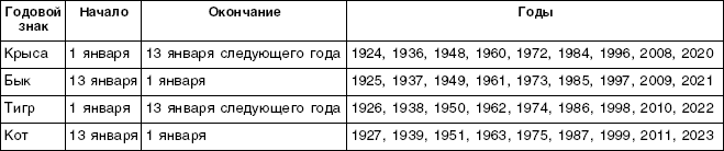 12. Вопрос о границах годовых знаков не менее сложен. Отчего переход происходит зимой? Отчего нет никаких природных явлений, связанных с датой перехода? Почему четные годы на целый месяц продолжительнее нечетных лет? В любом случае пока можно уверенно говорить только об экспериментальном факте. Эксперимент установил следующие даты, и знать о них должен каждый (таблица 12).