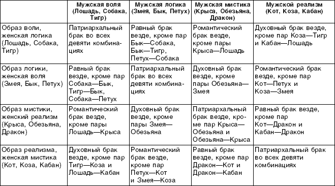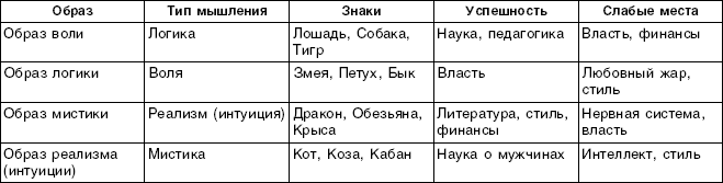 Таким образом, женское царство разбивается на две половины (у мужчин, заметим, такого деления нет). На одной половине торжествует союз логики и воли (Петух, Змея, Бык, Лошадь, Собака, Тигр). Памятуя о том, что на возрастной шкале именно эти знаки организуют мужской путь следования по жизни, можно сказать, что эти знаки организуют территорию параллельную мужскому миру, они могут идти с мужчинами плечом к плечу, помогая тем вершить мужские дела, а порой способны и конкуренцию составить. В каких сферах? Да во всех, начиная от высших сфер власти до высших интеллектуальных проявлений.