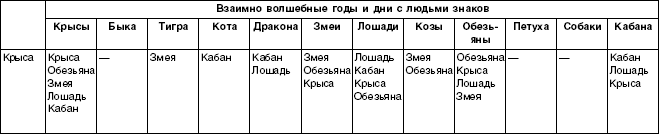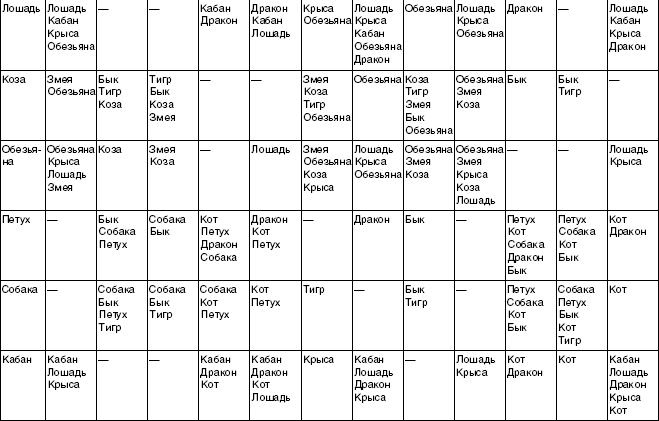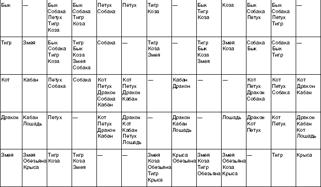 Принцип построения таблицы понять очень просто. Пять из двенадцати взаимно волшебных годов или дней есть у двоих людей одного и того же знака. По четыре таких волшебных острова имеют участники векторных пар. По три волшебных острова у тех, кто имеет одного общего векторного соседа. По два взаимно волшебных года у тех, кто в векторной цепи имеет два знака в промежутке. Наконец, один волшебный остров дан тем знакам, которые в векторной цепи отстают друг от друга на счет «четыре». Остаются еще три знака, с которыми совместное волшебство невозможно в принципе. Значит ли это, что те, кто к этим знакам принадлежат, не могут полюбить друг друга? Нет! Просто пожар в их душах будет возгораться по очереди. Такой сложной любви не позавидуешь.